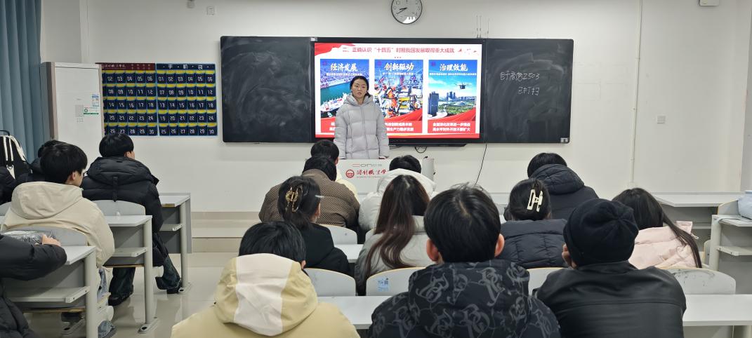 张梦麒以“一张蓝图、六个坚持、十二项任务”为骨架,带领同学全景速览二十届四中全会精神。她从“十五五”时期在基本实现社会主义现代化进程中的“承前启后”关键定位切入,剖析世界百年变局加速演进背景下中国“战略机遇与风险挑战并存”的复杂形势,指出全会将“教育—科技—人才一体发展”升格为中国式现代化的基础性、战略性支撑。随后,她用“制度自信是青春最鲜亮的底色,治理现代化是青年最广阔的赛道”作结,阐释“两个确立”对青年把稳思想之舵的决定性意义,鼓励同学把爱国情、强国志、报国行自觉融入“十五五”宏伟蓝图,在时代洪流中校准价值航向、激荡青春动能。