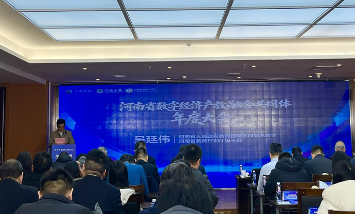 2026年1月29日下午14时,河南省数字经济产教融合共同体年度理事大会在河南大象融媒体集团召开。本次大会以“深化产教融合,赋能数智未来——构建河南数字经济高质量发展新生态”为主题,汇聚省内高校、行业龙头企业及政府相关部门代表,共探数字经济产教融合创新路径。开封职业学院数字经济学院院长李刚、副院长申晶受邀参会,学校正式成为共同体新增副理事长单位。