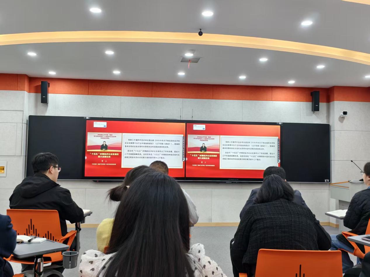 2026年3月31日下午,数字经济学院党总支组织开展学习贯彻党的二十届四中全会精神专题培训,集中学习《“十五五”时期经济社会发展的重大战略任务》。党总支书记李刚、党总支副书记王志涛、副院长申晶及全体教职工参加学习。